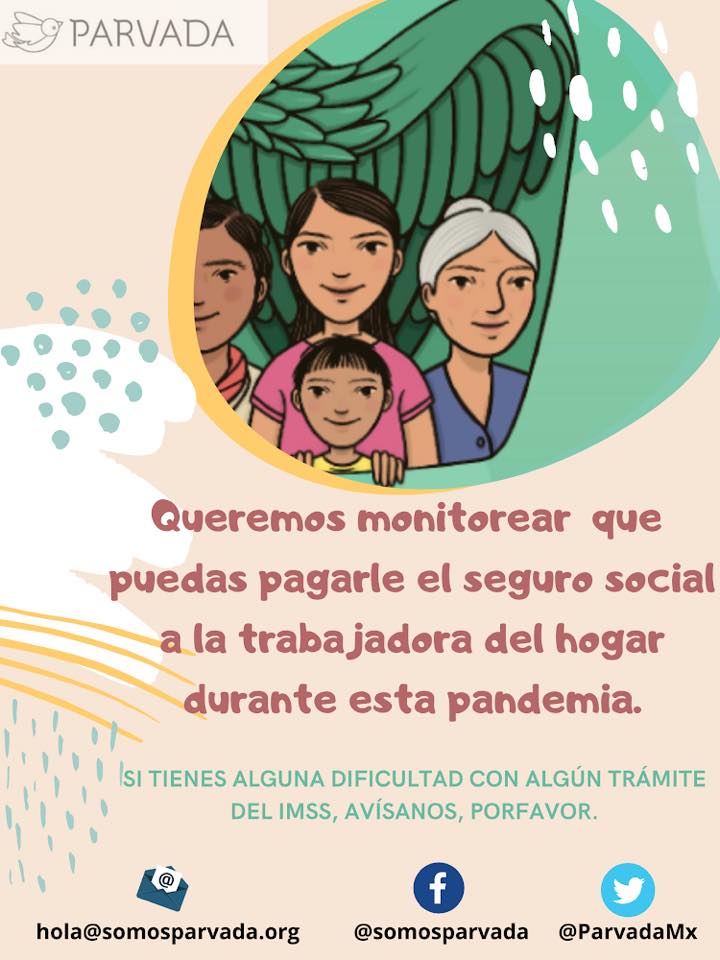 Ana Calderón, directora de Parvada explica que la mejor manera de ser un hogar responsable para las empleadas frente a la pandemia del coronavirus es pagarles los días, afiliarlas al Instituto Mexicano de Seguro Social (IMSS), pues tienen ese derecho, y darles días de descanso durante el tiempo que dicten las autoridades, pues así se acatarían las recomendaciones emitidas y se evitarían posibles contagios: