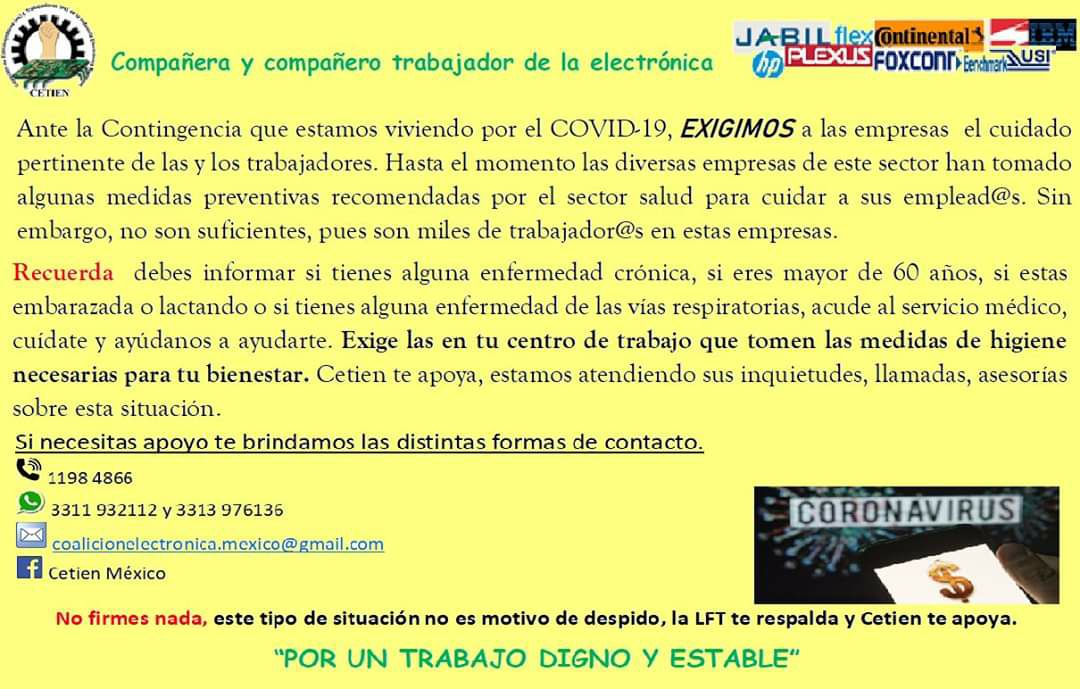 De frente a este contexto y tras el anuncio de la emergencia sanitaria, el pasado lunes 30 de marzo en México, las y los trabajadores de la industria electrónica en Jalisco, se enfrentan a un mayor escenario de incertidumbre y temor, no sólo por las omisiones acumuladas en las que han incurrido sus empleadores, sino, por el profundo desinterés que éstos muestran ante la vida de las y los obreros, sus familias y de la población en general.