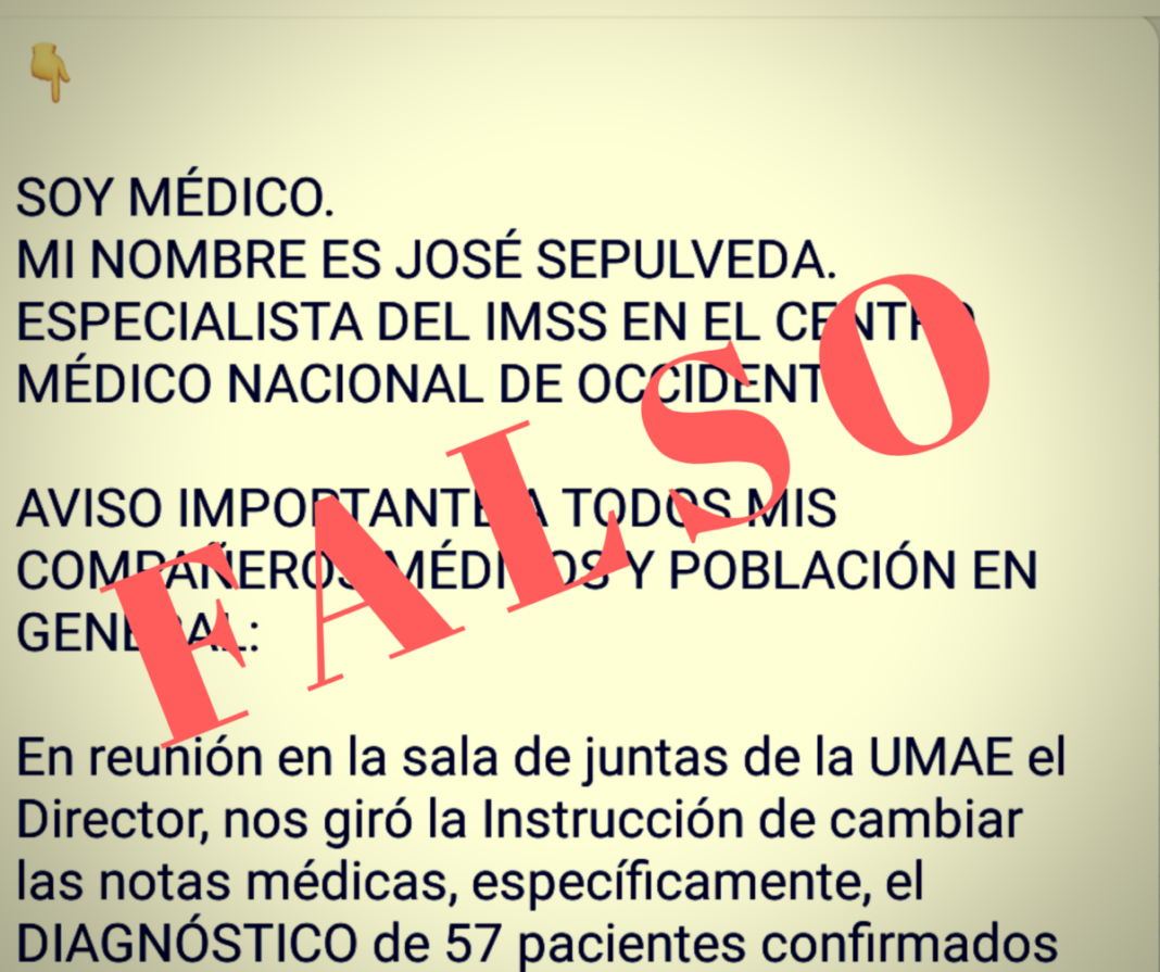 Otro hecho para mostrar la falsedad de la información es que el mismo mensaje firmado por el supuesto médico, José Sepúlveda, y señalando la alteración de los registros de COVID-19, circuló entre el 7 y 8 de abril -también través de WhatsApp- en Venezuela sólo que allá se alteraron las siglas: IMSS -que aparecen en el mensaje que se difundió en Jalisco- por las del IVSS (Instituto Venezolano de los Seguros Sociales).