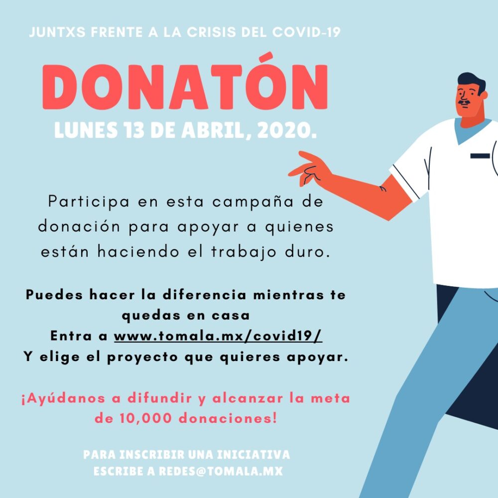 Si te interesa sumarte a esta campaña sólo tienes que acceder a www.tomala.mx/covid19/, elegir el proyecto al que quieres apoyar y realizar ahí de manera directa tu donación.
