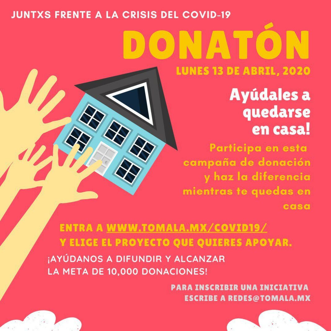 Con el objetivo de apoyar a familias que están enfrentando dificultades para cuidar su salud y subsistir durante la pandemia por el coronavirus, la organización jalisciense ¡Tómala! lanzó una invitación a sumarse a la campaña Donatón, juntxs frente a la crisis del Covid-19 que inicia este lunes 13 de abril de 2020 y que buscará llegar a las 10 mil donaciones.