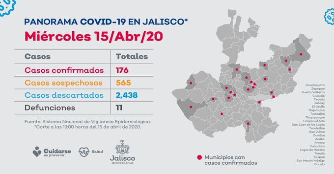 Hasta el 16 de abril en Jalisco se tienen registrados: 176 casos positivos; 565 sospechosos; 2,438 negativos y 11 decesos por COVID-19. Los municipios con mayor número de casos son: Guadalajara con 59, Zapopan (53), Puerto Vallarta (15) y Cuautla (10).