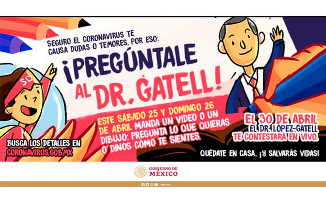 Tienes que mandar, entre el 25 y 26 de abril, un video de hasta 30 segundos con todas las preguntas que quieres hacerle al Dr.Gatell o también puedes mandar un dibujo compartiendo cómo es que te sientes durante este distanciamiento social; ambas propuestas serán tomadas a consideración para que el mismísimo funcionario pueda contestarte durante la rueda de prensa del 30 de abril.
