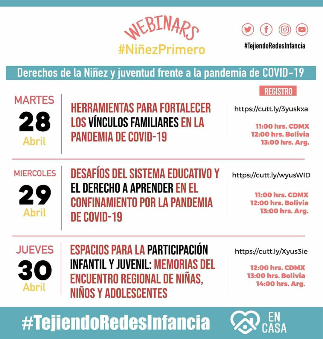 El proyecto Tejiendo redes infancia comparte a través de sus redes sociales el ciclo de webinars #NiñezPrimero en el marco del Día de la Niño y el Niño; éstos se han llevado a cabo desde el mes de marzo. Como cada conferencia virtual, las últimas dos presentaciones se transmitirán a través de la plataforma zoom los días 29 y 30 de abril de 2020.