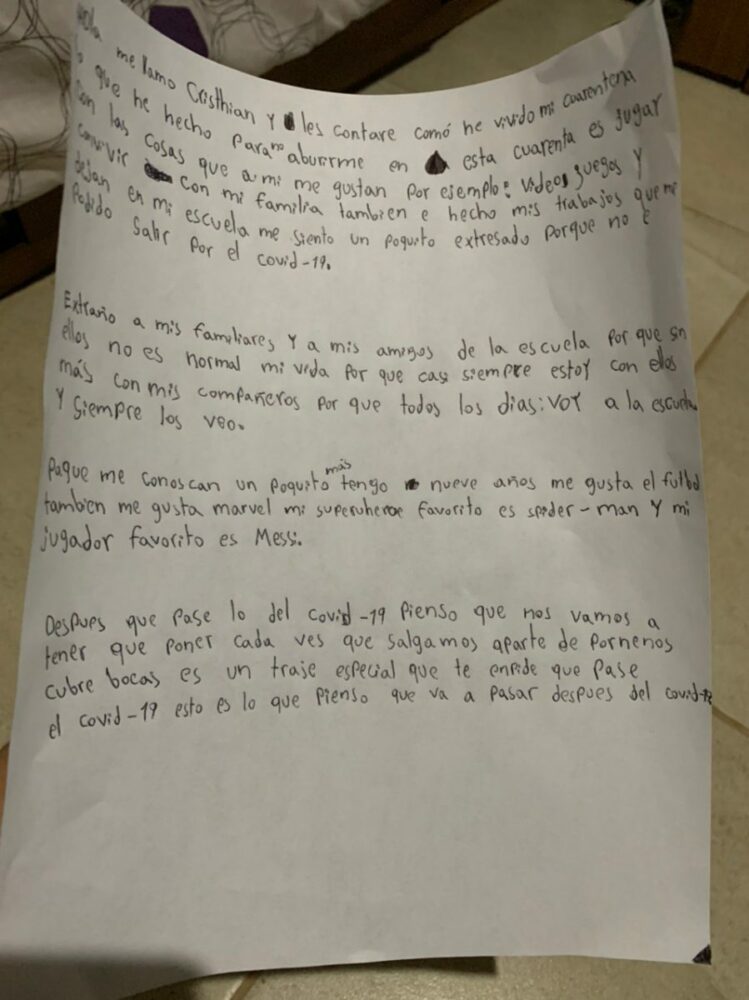 Hola, me llamo Cristhian y les contaré cómo he vivido mi cuarentena. Lo que he hecho para no aburrirme en esta cuarentena es jugar con las cosas que a mí me gustan, por ejemplo: video juegos y convivir con mi familia. También he hecho mis trabajos que me dejan en mi escuela. Me siento un poquito estresado porque no he podido salir por el COVID-19.