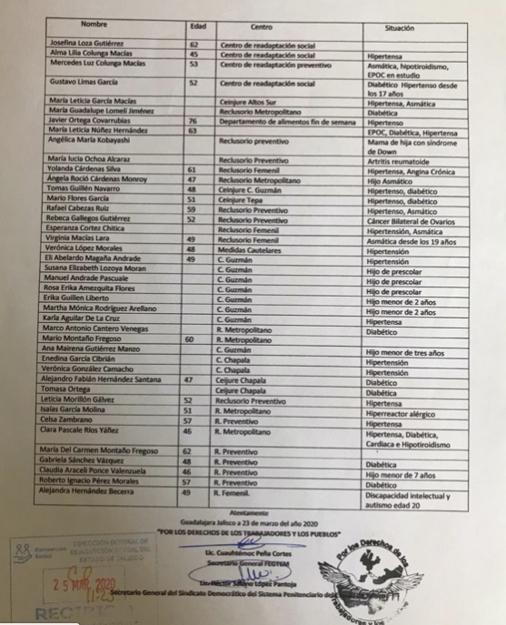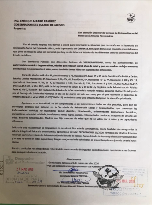 Sin embargo, el doctor Héctor López Pantoja, secretario general del Sindicato Único Independiente de los Reclusorios del Estado de Jalisco, asegura que el actuar de las autoridades ha sido lento, provocando no sólo incertidumbre, sino también la exposición del personal que se encuentra entre los grupos vulnerables al coronavirus; es decir, personas con enfermedades bronco-respiratorias, crónicas degenerativas y mayores de 60 años, pues pese a que desde el pasado 24 de marzo se envió un documento al Gobierno de Jalisco solicitando el resguardo domiciliario de estos trabajadores, pero hasta apenas el día 28 esta solicitud fue aprobada y 42 personas dejarán temporalmente sus labores.