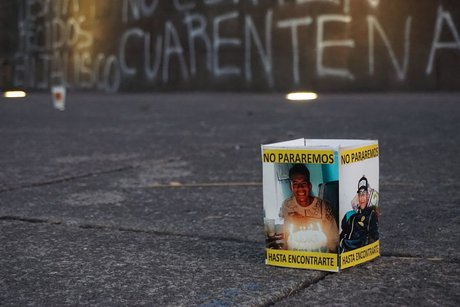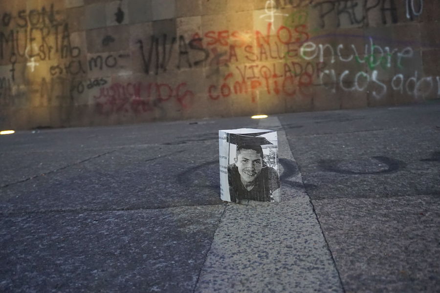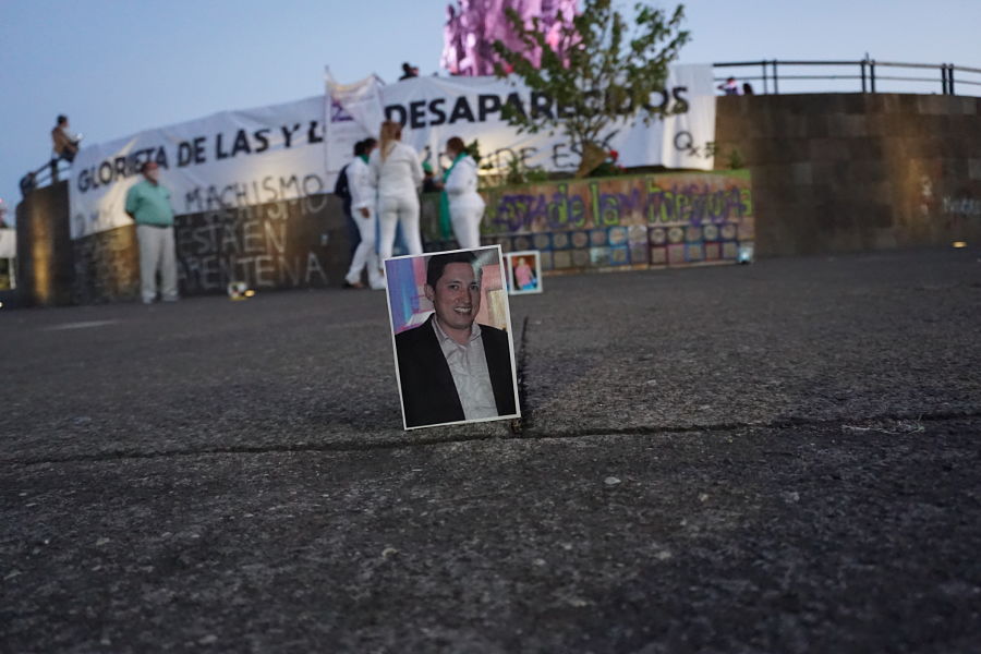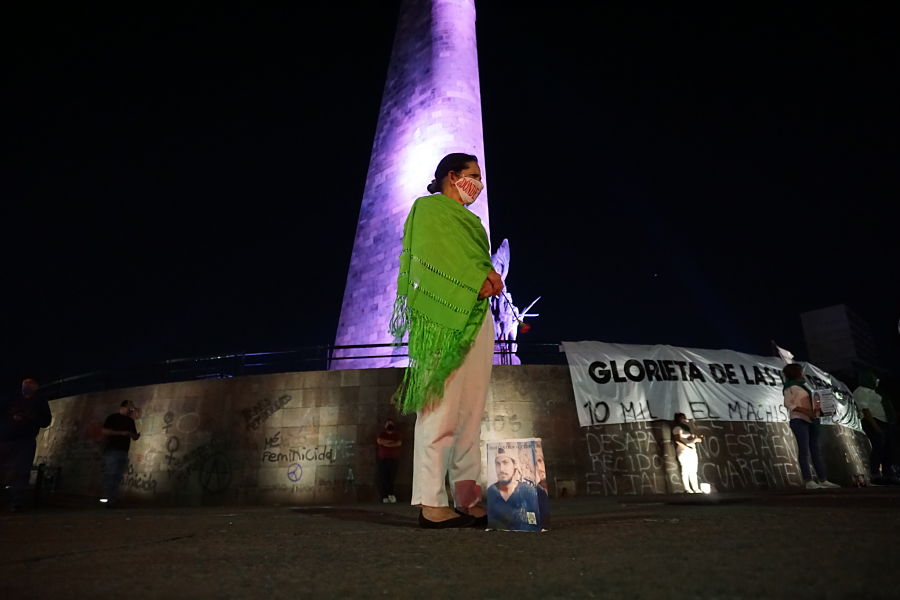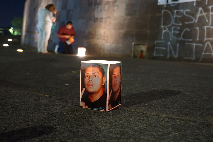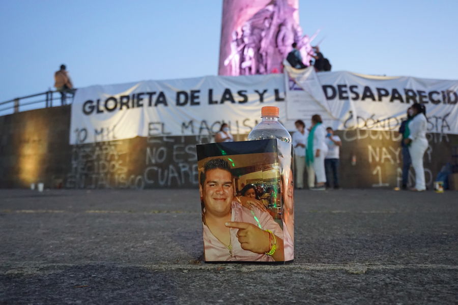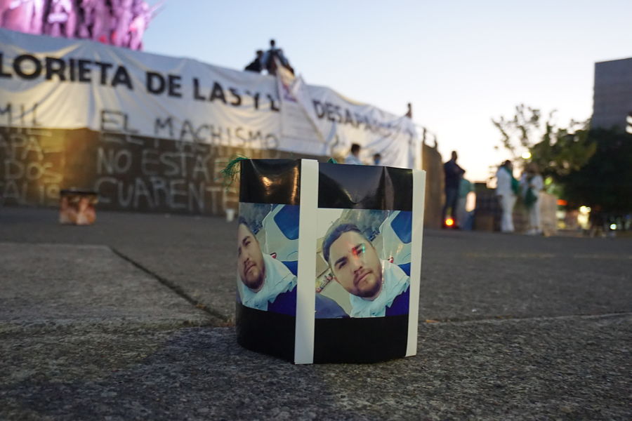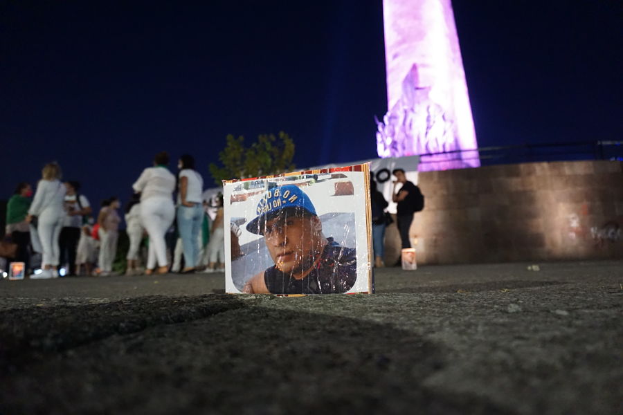 Entrada la noche y portando rebosos color verde, madres que forman parte de la organización Familias Unidas por Nuestros Desaparecidos en Jalisco (FUNDEJ) reafirmaron el grito: “Nada que celebrar” con una acción simbólica en la que iluminaron las fotografías de sus hijos e hijas desaparecidas. Rodeada la explana de la Glorieta con sus imágenes entonaron canciones de lucha y protesta, reafirmando el amor por sus ausentes y exigiendo al Estado su regreso
