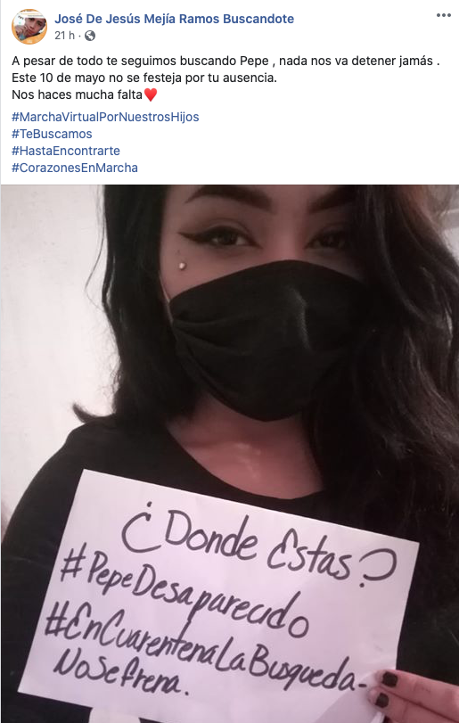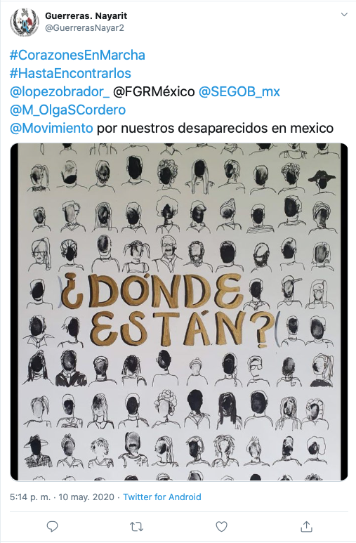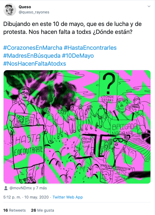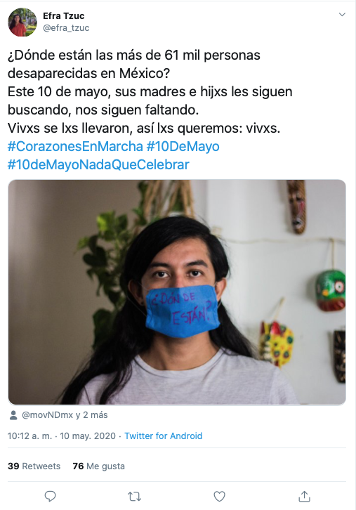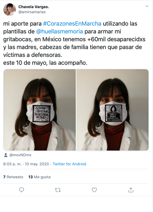 “Hoy miles de mujeres no pueden celebrar el #diadelasmadres porque sus hijos e hijas están desaparecidas. No olvidamos #CorazonesEnMarcha”, escribió desde su cuenta de Twitter, Ixchel Cisneros, quien fue una de las más de 10 mil personas que usó sus redes sociales digitales para sumarse a la protesta virtual que se convocó desde el Movimiento Nacional por Nuestros Desaparecidos en México y que consistió en usar el habitual cubre bocas que usamos, desde que arrancó la pandemia de COVID-19 en México, como un medio de protesta para señalar que en México siguen existiendo más de 61 mil desaparecidos y que, por ello, no había nada que celebrar el 10 de Mayo.