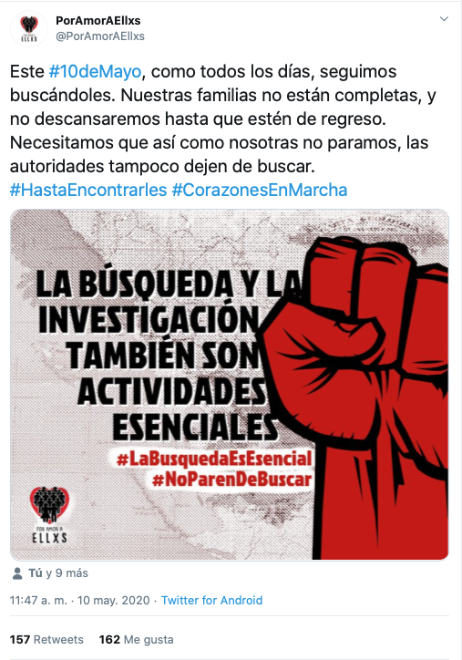 “en medio de la emergencia sanitaria, no dejaremos de sumar nuestras voces, nos pronunciamos desde cada rincón del país, para seguir exigiendo el regreso a casa de todas las personas desaparecidas, verdad, justicia y garantía de no repetición”.