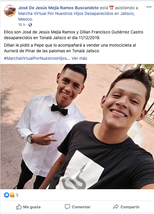 En el caso de Jalisco, las familias de las y los desaparecidos también realizaron acciones virtuales como la convocada por los familiares de dos jóvenes que fueron víctimas de desaparición el pasado 11 de diciembre de 2019: José de Jesús Mejía Ramos de 22 años y Dillan Francisco Gutiérrez Castro de 19 años; ambos salieron de su domicilio ubicado en Zapopan para dirigirse a la colonia Pinar de las Palomas en el municipio de Tonalá; sin embargo, nunca regresaron a casa.