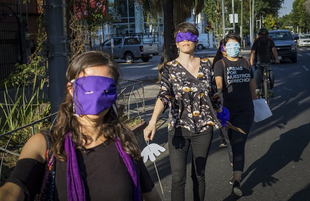 Con los ojos tapados con un cubrebocas, un grupo de mujeres realizaron la tarde del jueves 21 de mayo un performance con la intención de denunciar que –a pesar de que más del 60% de los ciudadanos de Jalisco se encuentran confinados por la pandemia por el virus COVID-19-, las desapariciones, los feminicidios, las violencias de género, la invasión de territorios comunitarios van en aumento en el estado y el país.