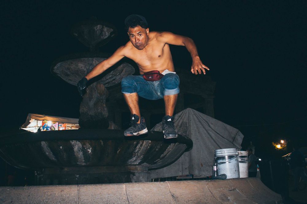 Son las ocho de la noche, Sergio está haciendo ejercicios de calentamiento a la par de que prepara sus cosas. Como si fuera a competir para una prueba olímpica, las calles del centro de Ciudad Guzmán (Zapotlán El Grande, Jalisco) son su arena de entrenamiento. Por su torso desnudo se deslizan gotas de líquido que van cayendo al suelo con el ritmo de sus brincos y movimientos, no es sudor, es el agua de la fuente con la que se moja para mantenerse fresco.
