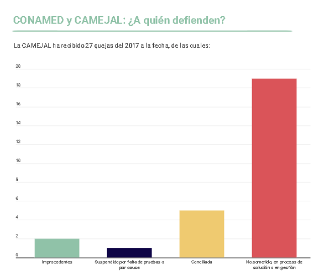 Del 2013 al 2019, en CONAMED se presentaron 54 quejas; de éstas sólo 16 llegaron a una conciliación, de éstas, seis lograron llegar a un acuerdo a partir de una transacción económica; 10 aceptaron la aclaración médica. Mientras que dos quejas fueron desechadas como “falta de interés procesal”. El resto de las 36 quejas, más del 65% se clasificaron como no conciliatorias; es decir, ninguna llegó a un arreglo debido a que una de las partes no tuvo la voluntad de conciliar la problemática.