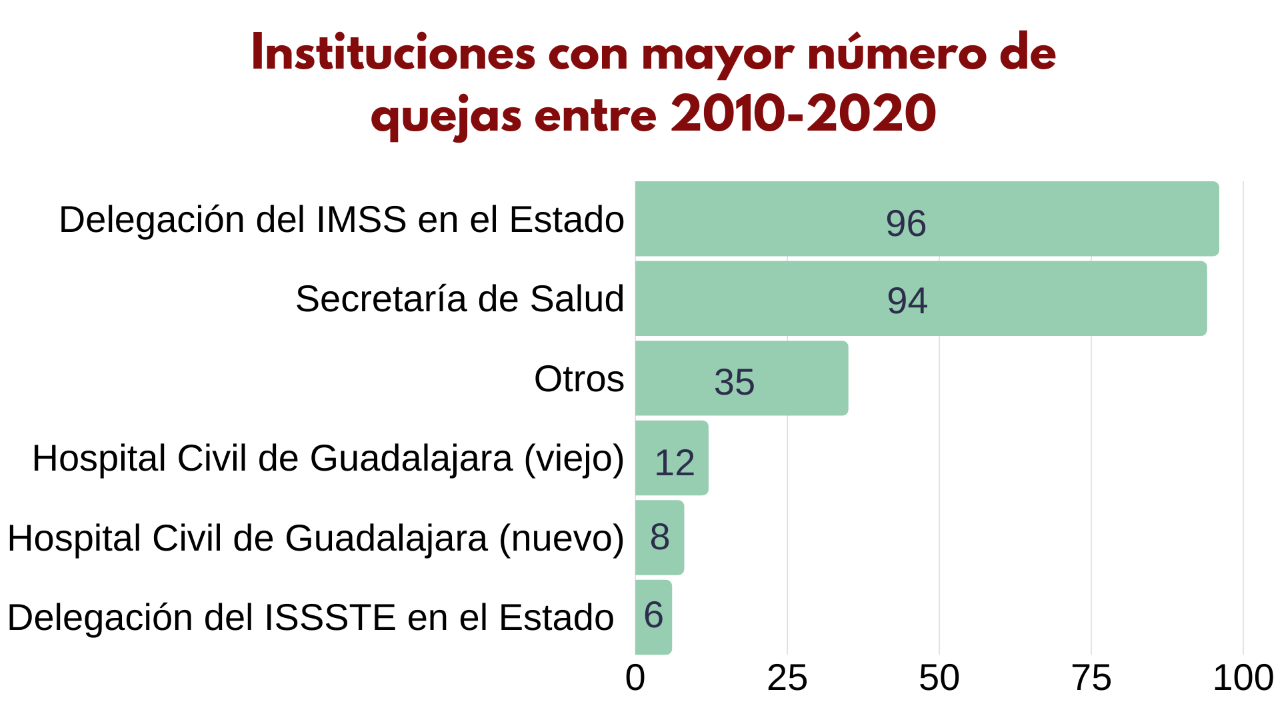 Guadalajara fue la entidad con mayor número de quejas con 31 quejas de las 54, después se encuentra Zapopan con ocho. El instituto al que se le señala con más quejas fue al IMSS, responsable de 43 denuncias, seguido del ISSSTE con 10 y una queja de las instancias médicas de la SEDENA. Traumatología y ortopedia general fueron las especialidades médicas con el mayor número de quejas con ocho acumuladas para ambas áreas. Después se encuentran urgencias y ginecología con cinco quejas cada una.