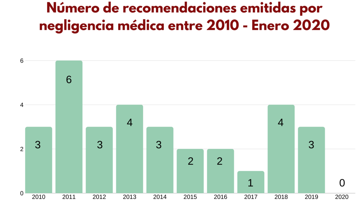 De acuerdo con datos aportados por la CONAMED, entre 2013 y 2019 se presentaron 28 quejas que involucran a mujeres como víctimas de negligencias médicas. De éstas, cinco se cometieron en el área de ginecología, dos en hospitales del IMSS y tres en el ISSSTE. En este periodo se presentó sólo un deceso en el área de obstetricia.