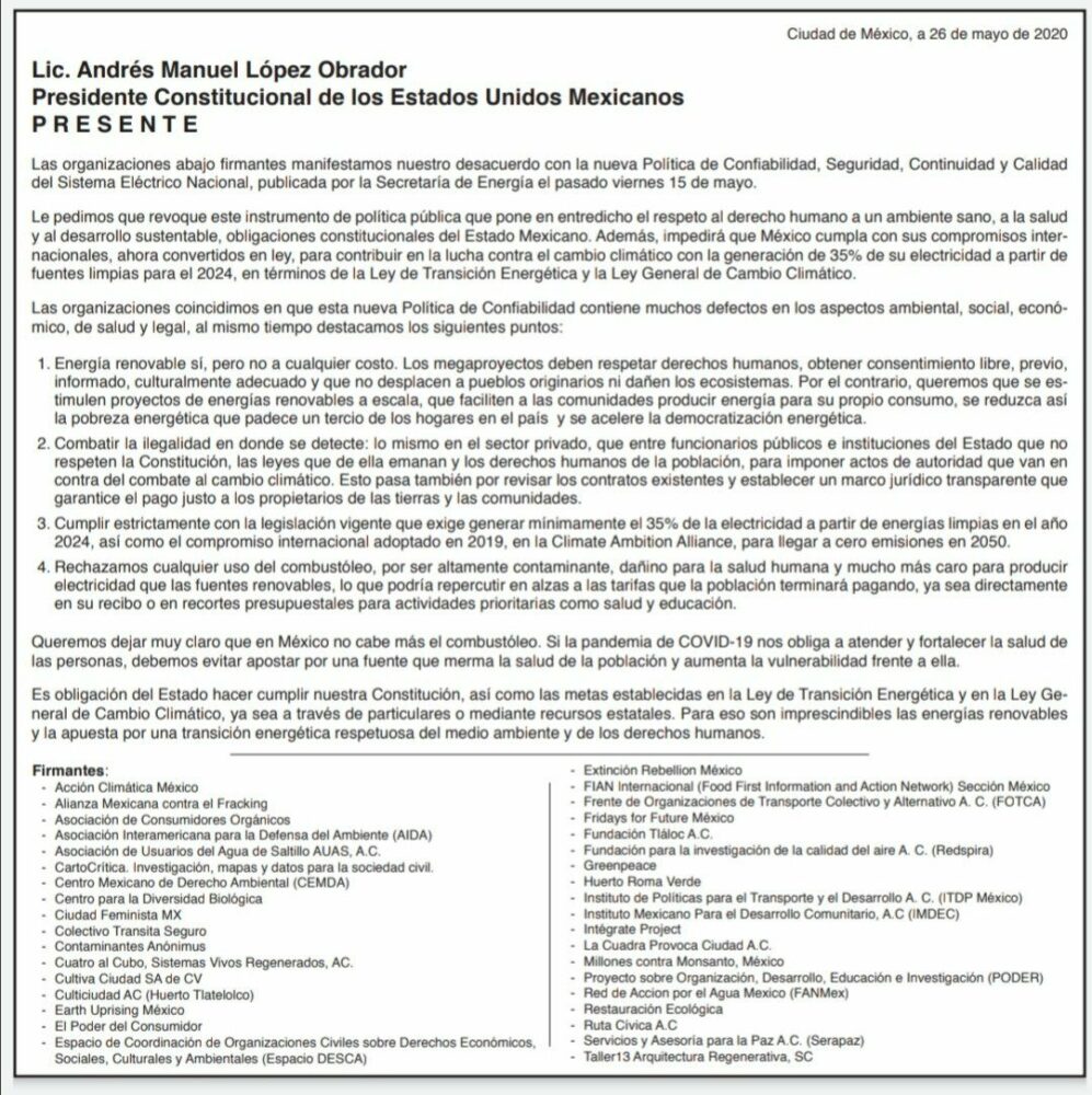 Mencionó que el movimiento ha seguido de cerca las acciones del Gobierno Federal en materia ambiental y se encuentran preocupados; sin embargo, el acuerdo de la CENACE “fue la gota que derramó el vaso” y se vieron obligados a exigir acciones que no sólo “sean en beneficio de los combustibles fósiles”: