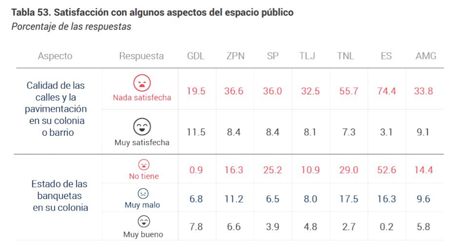 De acuerdo con la Encuesta de Percepción Ciudadana 2018 de Jalisco Cómo Vamos, el 14.4% de las personas consultadas dijeron que en su colonia o barrio dentro del AMG no había banquetas. A la insatisfacción con el espacio público se suman 33.8% de los encuestados que dijeron que no estaban nada satisfechos con la calidad de las calles y la pavimentación del lugar en el que vivían.