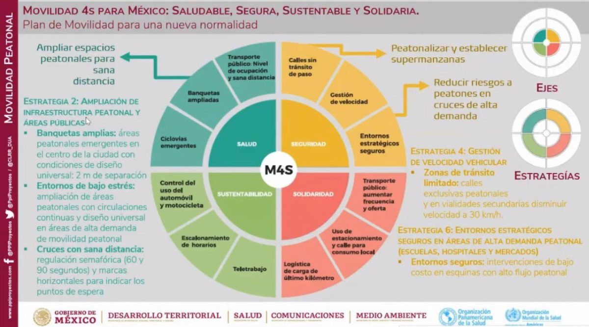 Este plan, hecho por varias instituciones federales a propósito del fin de la Jornada de Sana Distancia, toma en cuenta como ejes las “cuatro S” incluidas en su nombre, las cuales proponen, entre otras cosas, la ampliación de banquetas y menor tiempo de espera en cruces peatonales para evitar aglomeraciones.