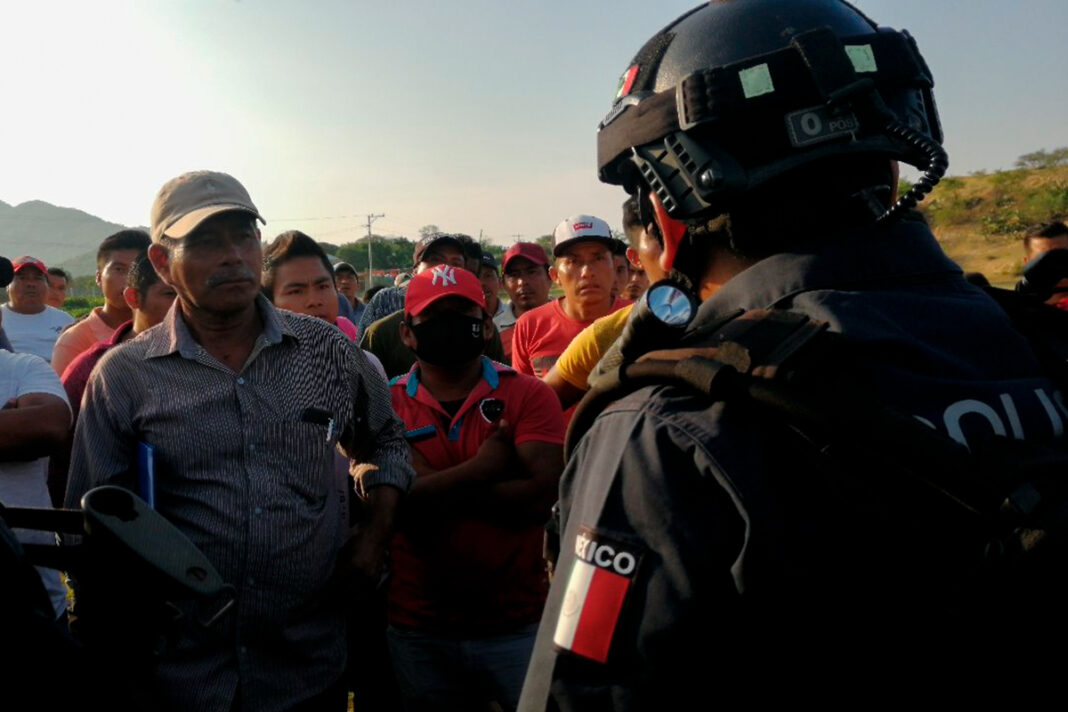 “Como a las 8, 9 de la noche”, relata la habitante A de San Mateo del Mar, “nos dicen los compañeros que estaban en Huazantlán, empezaron a detonar armas dentro de la agencia de Huazantlán, que ha estado tomada desde el 3 de mayo por gente armada y la Guardia Nacional y la Policía Municipal, en lugar de quedarse a garantizar la seguridad de las personas, quiso salir a la fuerza y salió a la fuerza con golpes, disparos al aire, gas lacrimógeno”.