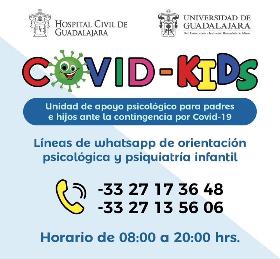 Si lo que buscas es material de apoyo terapéutico, ocupacional, recreativo y educativo para niños, niñas y adolescentes durante el aislamiento por COVID-19, el Hospital Civil de Guadalajara pone a disposición la página COVID KIDS. Las líneas de WhatsApp de orientación psicológica y psiquiatría infantil son 33 27 17 36 48 y 33 27 13 56 06