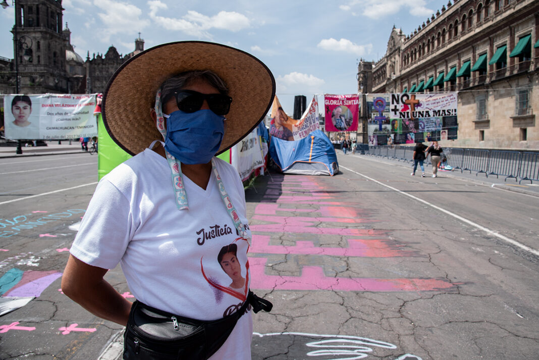 El feminicidio de Diana Velázquez cambió la vida de su madre, Lidia Florencio. Dejó su trabajo de ama de casa para apropiarse de las calles y buscar sin descanso que las autoridades encuentren al asesino de su hija. Nunca falta a las manifestaciones feministas y decidió apoyar al plantón, a pesar de la pandemia.