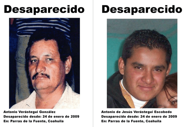 *Jorge Verástegui González es licenciado en Derecho por la Universidad Autónoma de Nuevo León, con especialidad en Derechos de las Personas Desaparecidas y sus Familiares por la Universidad Autónoma de Coahuila, hermano de Antonio Verástegui González y tío de Antonio de Jesús Verástegui Escobedo, que fueron desaparecidos en Parras, Coahuila el 24 de enero de 2009.