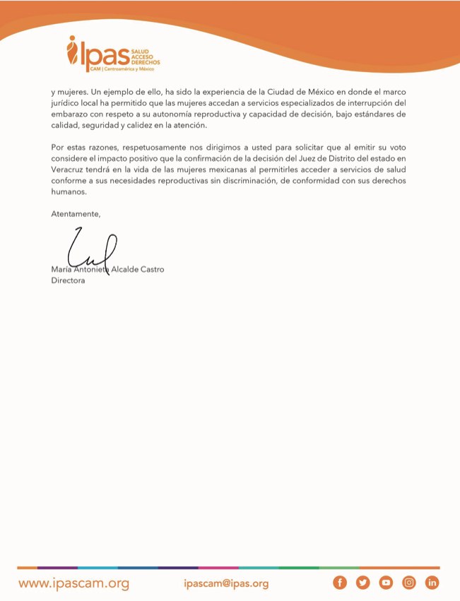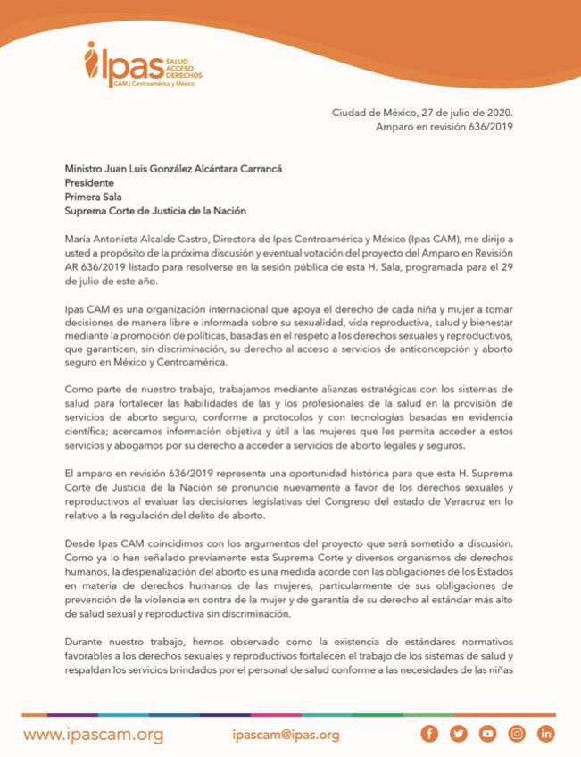 De la misma forma, el pasado 27 de julio, la Directora de Ipas CAM, María Antonieta Alcalde Castro envío una carta al Ministro Juan Luis González Alcántara Carrancá, Presidente de la Primera Sala de la SCJN y responsable de iniciar este amparo que permitirá la discusión de la tipificación del aborto en la legislación penal del estado de Veracruz, en la cual recordó a la SCJN que: