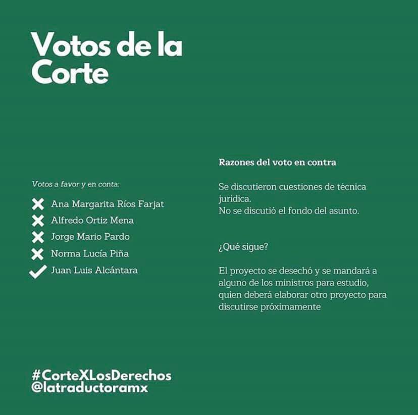 Ana Margarita Ríos Fajart; Alfredo Gutiérrez Ortiz Mena; Jorge Mario Prado Rebolledo; y Norma Lucía Piña Hernández son los nombres de los cuatro ministros y ministras de la Primera Sala de la Suprema Corte de Justicia de la Nación (SCJN) que decidieron no pronunciarse a fondo sobre las modificaciones que planteaba el Amparo 636/2019 promovido por diversas organizaciones a favor de los derechos humanos de las mujeres desde hace más de cuatro años.