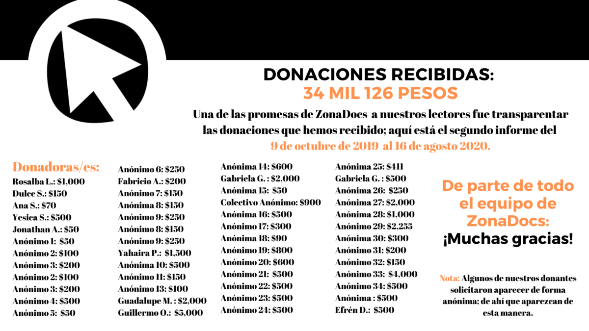 El pasado 9 de octubre de 2019, ZonaDocs arrancó su “Campaña de Donación”. Uno de nuestros compromisos fue el transparentar cada uno de sus donativos; así que hacemos público para todos nuestros lectores las donaciones solidarias que hemos recibido del 9 de octubre de 2019 al 16 de agosto de 2020, las cuales se realizaron: 1) En efectivo en el arranque de la Campaña, 2) De manera directa con alguno de los integrantes de la redacción, y 3) Mediante depósito o transferencia bancaria.
