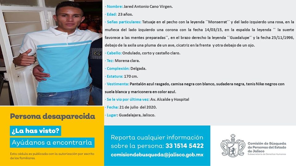 Jared Antonio Cano Virgen, de 23 años, desapareció de manera forzada el 21 de julio de 2020 en pleno centro de Guadalajara, Jalisco.