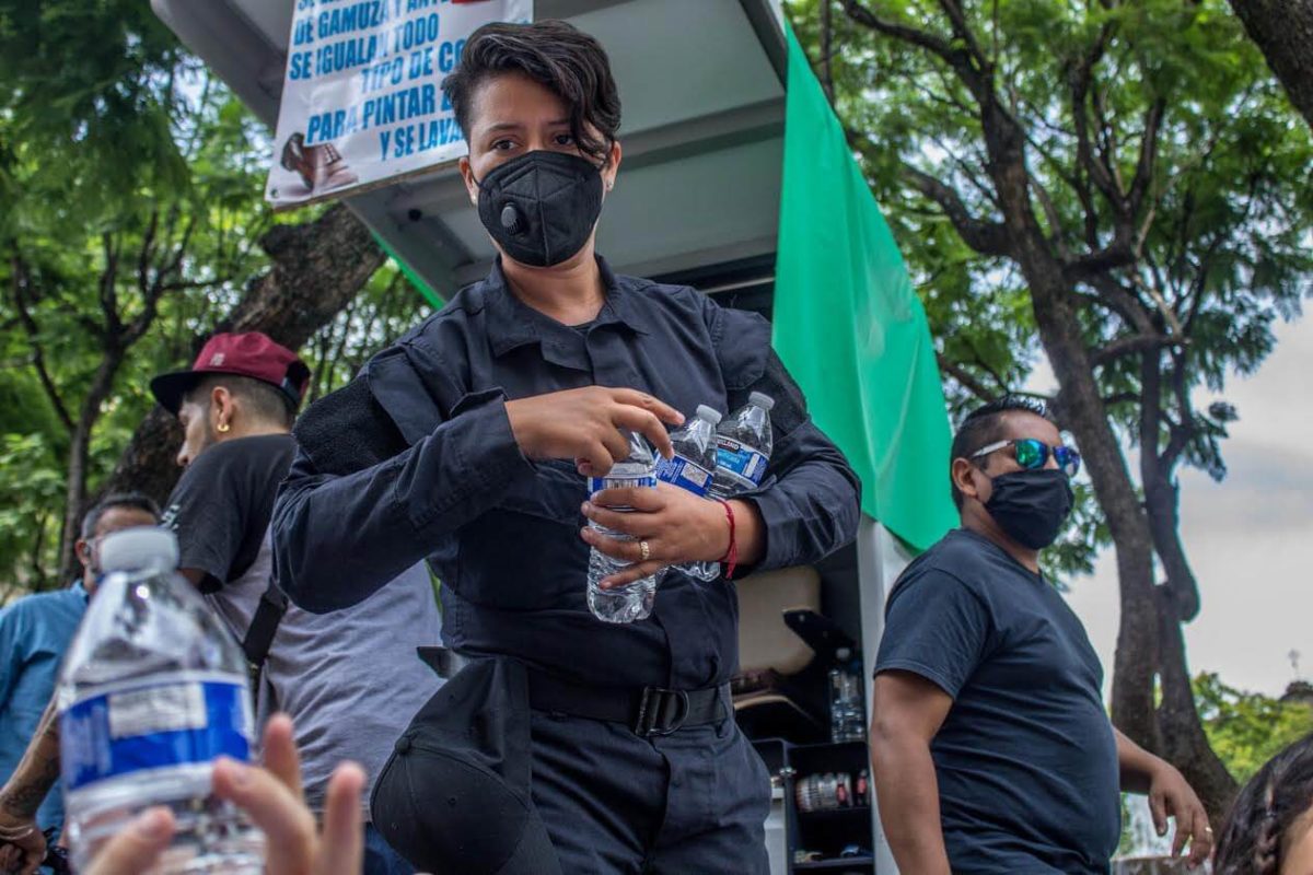 En medio de la convivencia, las mujeres policías salieron a regalar botellas de agua para las manifestantes.