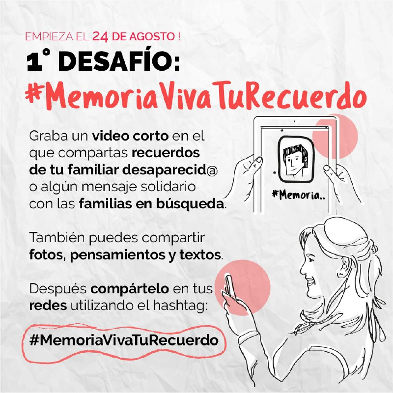Informaron que el primer desafío de esta campaña comienza este lunes 24 de agosto y podrá identificarse con el hashtag #MemoriaVivaTuRecuerdo; éste consiste en “evocar a las personas desaparecidas a través de algún recuerdo positivo” por medio de una imagen, un texto o un video corto en cualquier red social. Podrán participar familiares y todas aquellas personas que “tengan buen recuerdo de alguien que desapareció”.