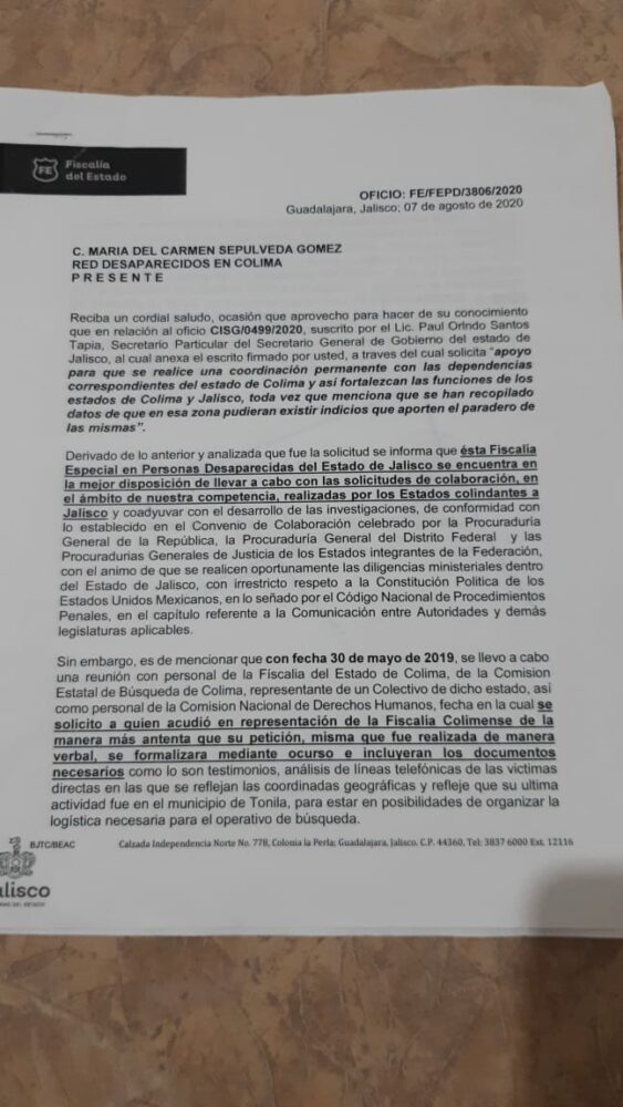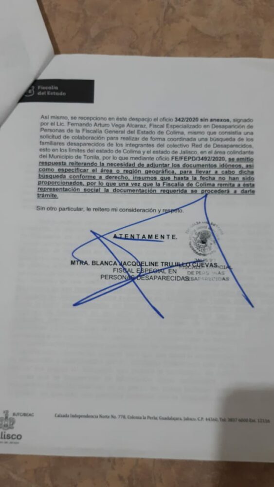 Respecto al actuar de las autoridades en Colima, bajo el número de oficio 342/2020 la Fiscalía Especializada en Personas Desaparecidas de aquel estado, hizo llegar a la Fiscal, Blanca Trujillo la misma petición de las familias, donde se hace de su conocimiento que la fiscalía colimense “cuenta con diversas carpetas de investigación iniciadas por el delito de Desaparición”, mismas que luego de la revisión de testimonios y “análisis de información de las líneas telefónicas de las víctimas (…) y la interpretación de las graficas de dichas líneas en base a las coordenadas, su última actividad es en el municipio de Tonila, Jalisco”.