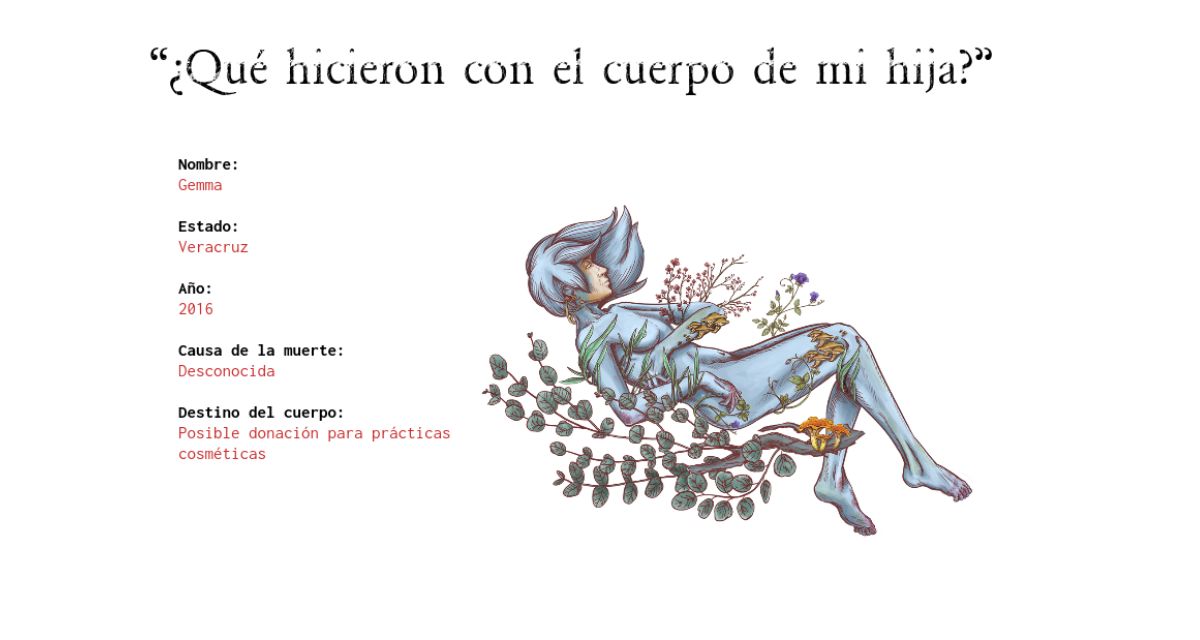 Tal es el caso de Gemma, quien fue secuestrada; murió y sus padres aún investigan si su cuerpo fue donado a una universidad privada. “Octavio” es un joven desaparecido, del que su familia sólo pudo recuperar su pierna, luego de que fuera utilizada para hacer estudios en una escuela. A “Javier” y José Luis aún los buscan sus familias con desesperación en facultades de medicina.