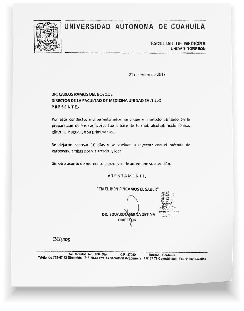 Documentos expedidos por la Facultad de Medicina de la UAdeC describen cómo los cadáveres son preparados utilizando una mezcla de formol, alcohol, ácido fénico, glicerina y agua. Después de 10 días de reposo, son inyectados con polietilenglicol, una sustancia comúnmente conocida como carbowax.