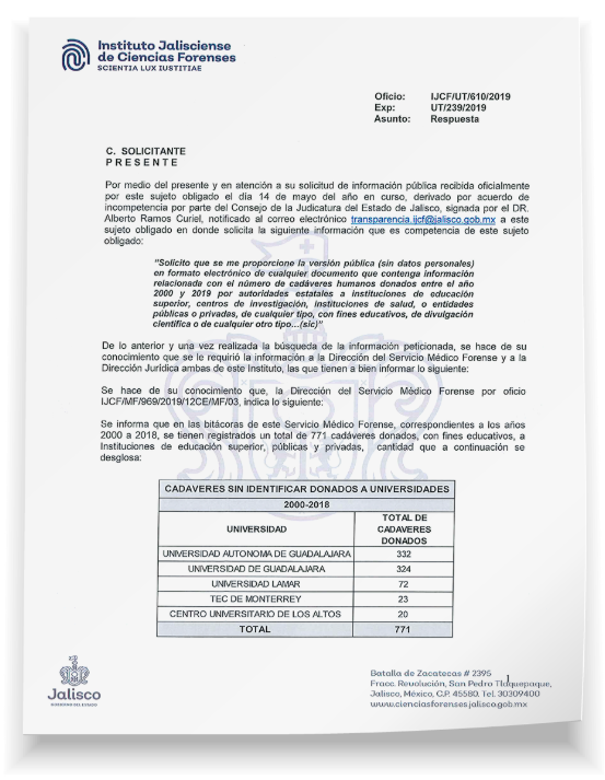 Según el IJCF, 324 de esos cadáveres fueron donados a la Universidad de Guadalajara (UDG), una institución pública de educación superior. Sin embargo, en un documento oficial obtenido vía Transparencia, la UDG reportó haber recibido 419 del IJCF, durante ese mismo periodo, lo que evidencia un faltante de 95 registros de donaciones.
