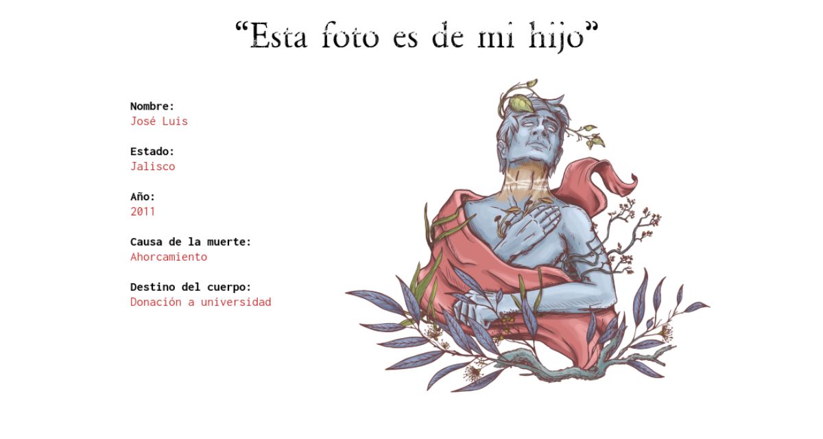 Aquella era la foto del cadáver de un hombre joven que yacía en la plancha de la morgue, desnudo, lavado y preparado para la autopsia. Al igual que José Luis, no tenía ninguna seña particular, ningún tatuaje, ni una cicatriz o marca de cirugía, solo una línea delgada en su cuello, pues había sido ahorcado con un alambre fino hasta su muerte.