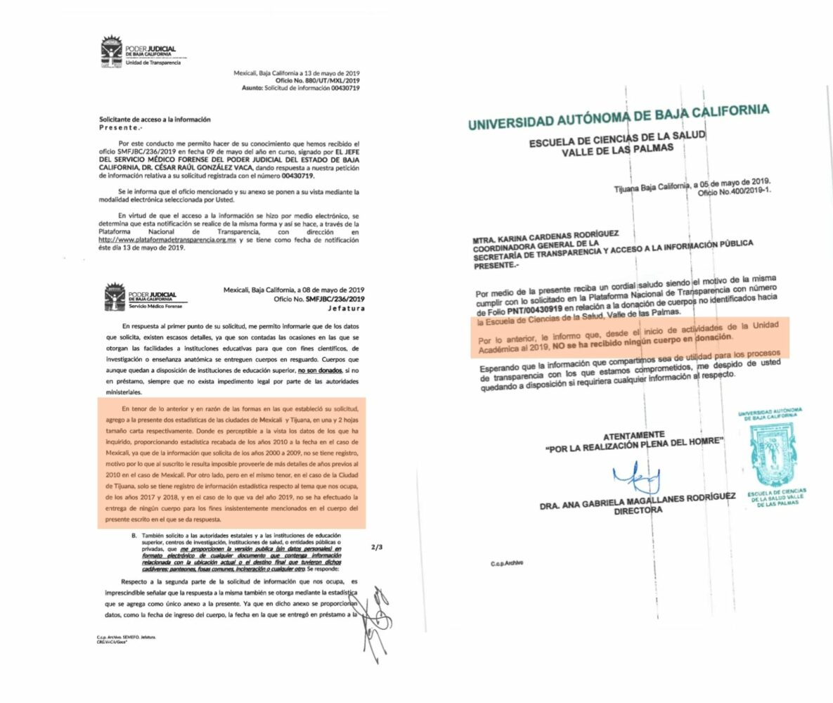En Veracruz, Tamaulipas, Guerrero y Querétaro, las fiscalías generales negaron, a través de oficios, haber donado o prestado cadáveres a instituciones educativas; no obstante, las universidades de esas mismas entidades presentaron documentos que corroboraron que sus estudiantes habían realizado prácticas de anatomía en cuerpos humanos facilitados por las fiscalías.