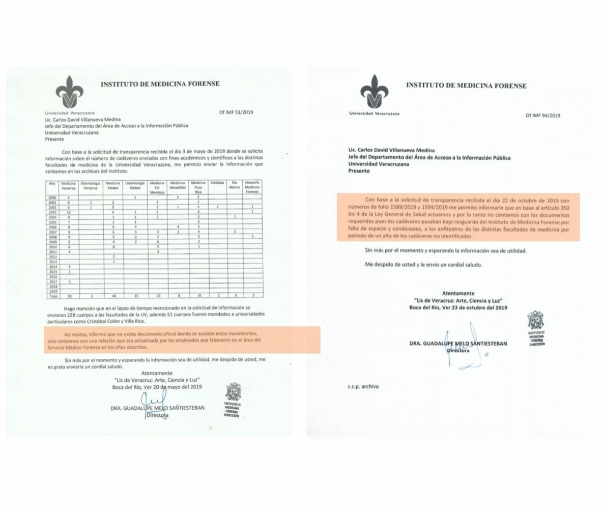 Otros 228 cadáveres fueron enviados durante las últimas dos décadas a las 10 facultades de medicina de la UV, según el oficio IMF 94/2019. Sin embargo, Carlos Villanueva, en el documento obtenido a través de una solicitud vía Transparencia en mayo de 2019, reconoce que la institución no cuenta con la documentación requerida para cada donación, “pues los cadáveres pasaban bajo resguardo del Instituto de Medicina Forense por falta de espacio y condiciones, a los anfiteatros de las distintas facultades de medicina por periodo de un año de los cadáveres no identificados”.