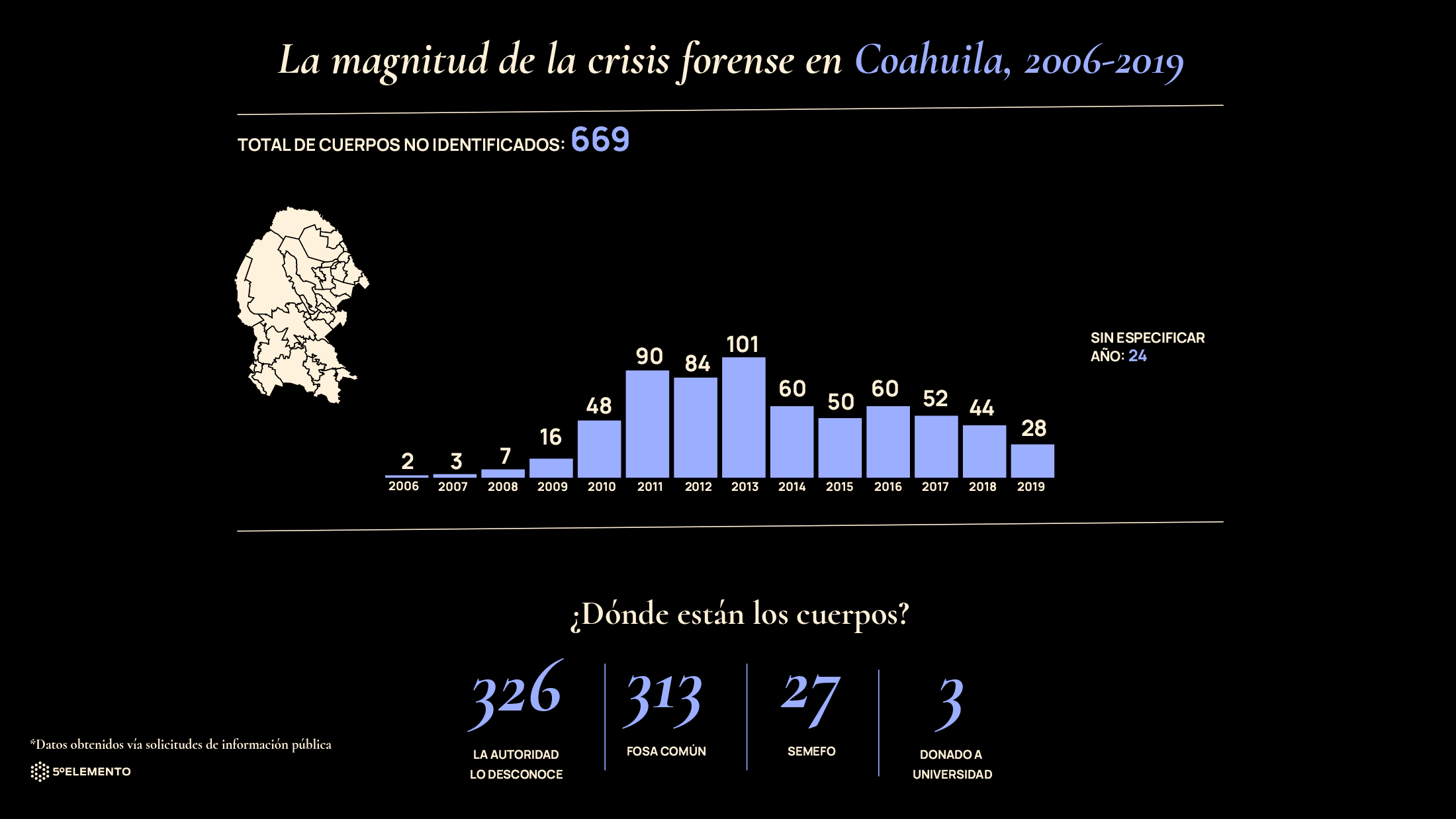 Según una respuesta de la Fiscalía de Coahuila a una solicitud de información (folio 00558120), en el estado hay 889 cuerpos que no fueron identificados, la mayoría de ellos asesinados entre 2006 y los primeros cinco meses de 2020 por disparos de arma de fuego o estrangulados, principalmente. En 66 casos los cadáveres estaban “incompletos”, de 12 tenían solo restos calcinados, seis estaban desmembrados, de 88 cuerpos tenían solo restos óseos y había 17 esqueletos.