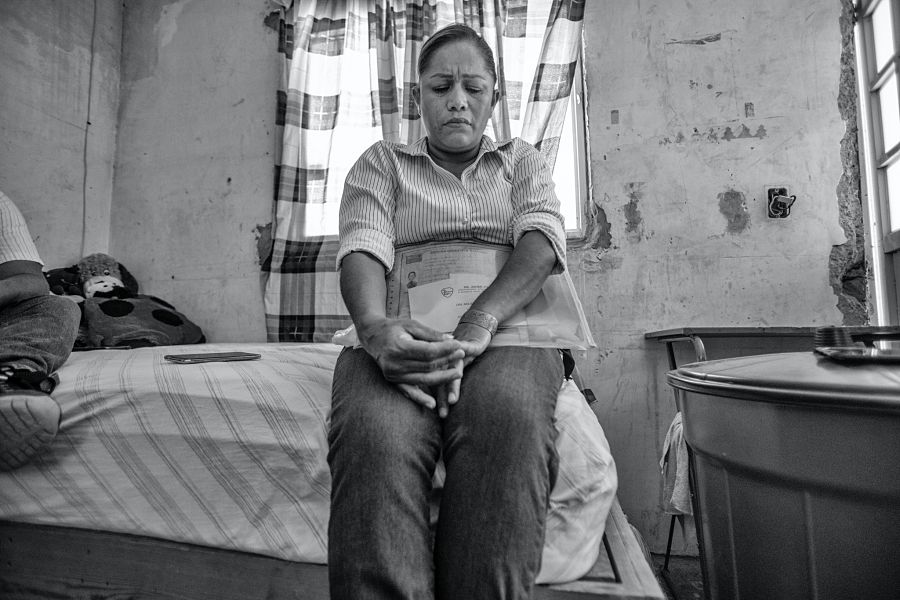 Platica Marcela Balderas desde su casa. Su casa son dos cuartos donde no hay puerta que los separe, tres camas, paredes de block sin enjarre ni pintura; una estufa, un tanque de gas, cajas con expedientes, dos guardarropas viejos.