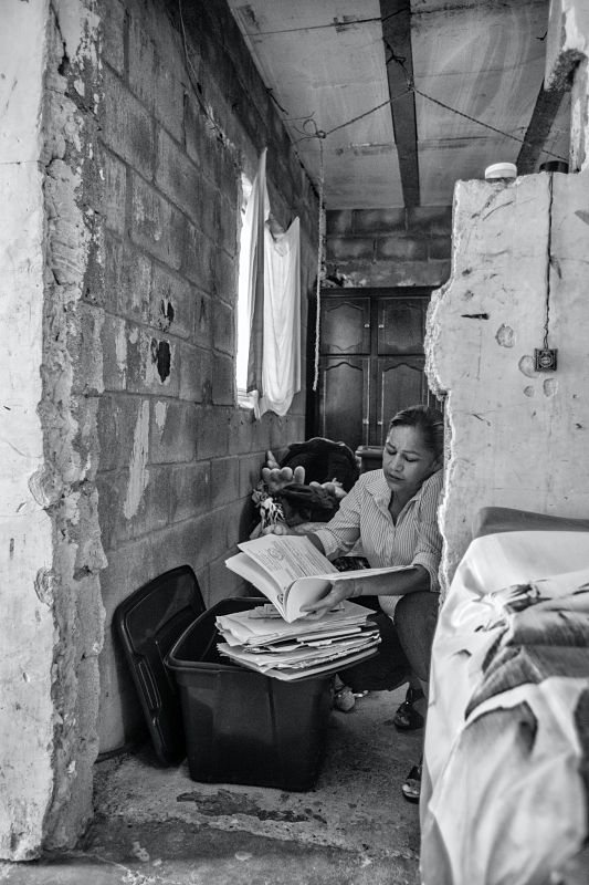 Marcela busca en una caja la libreta de su hijo Cosme, donde solía escribir pensamientos y citas bíblicas.