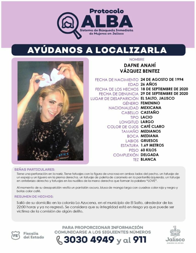 Lamentablemente, señaló la madre de Kenia, no sólo se trata de su hija y de su amiga, ese mismo 18 de septiembre fue desaparecida también, Dafne Anahí Vázquez Benítez de 26 años en la colonia La Azucena en el municipio de El Salto. Al respecto, Unión Diversa Jalisco, anunció la tarde del jueves 01 de octubre, que su ficha de búsqueda en Protocolo Alba ya fue publicada y difundida.