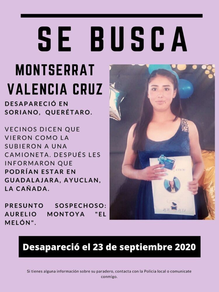 La menor de edad, Montserrat Valencia Cruz está desaparecida desde el 23 de septiembre; testigos aseguran que la adolescente de 16 años fue llevada a la fuerza por sujetos en una camioneta dentro de la colonia Soriano, municipio de Colón en el estado de Querétaro.