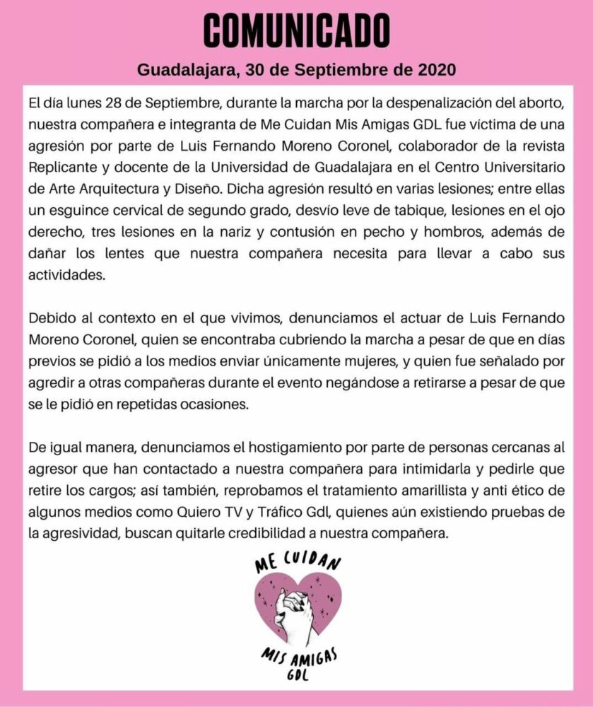 El pasado lunes 28 de septiembre, durante la jornada por el Día de Acción Global por un Aborto Legal y Seguro en Guadalajara, una integrante de la colectiva feminista Me Cuidan Mis Amigas GDL fue agredida por el fotógrafo, Luis Fernando “N”, quien con el lente de su cámara golpeó de manera contundente la cara de la joven, mientras ésta le señalaba que no grabara y fotografiara los rostros de las mujeres que se manifestaban.