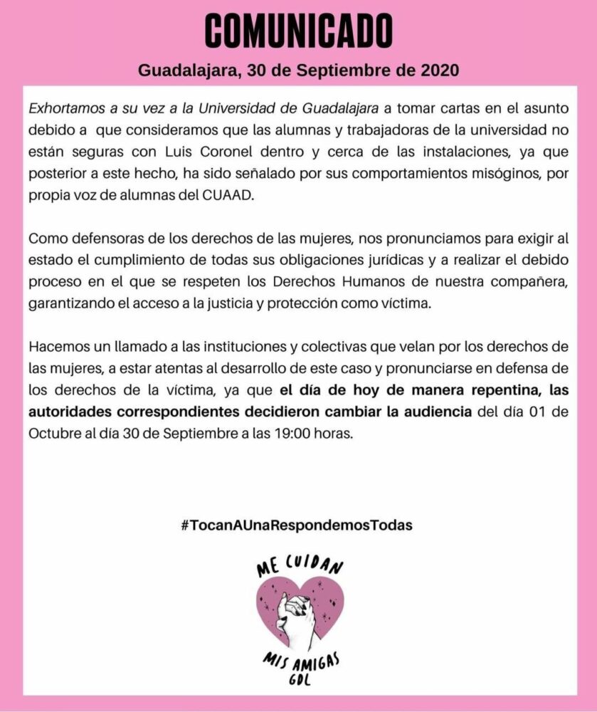 A través de un comunicado, la colectiva Me Cuidan Mis Amigas GDL informó que Luis Fernando “N” es un fotógrafo colaborador de la revista Replicante, así como, profesor de la Universidad de Guadalajara en el Centro Universitario de Arte Arquitectura y Diseño (CUAAD).