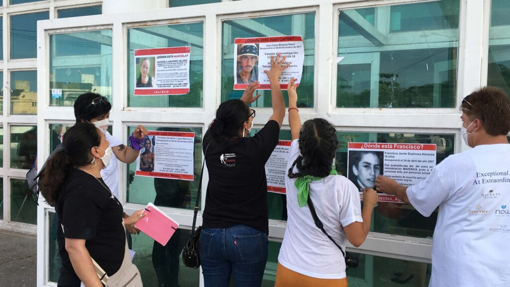 Familiares de víctimas de desaparición colocan carteles de búsqueda en la puerta de la Fiscalía Regional de Justicia Zona Costa de Puerto Vallarta, Jalisco. Crédito: Mónica Cerbón.