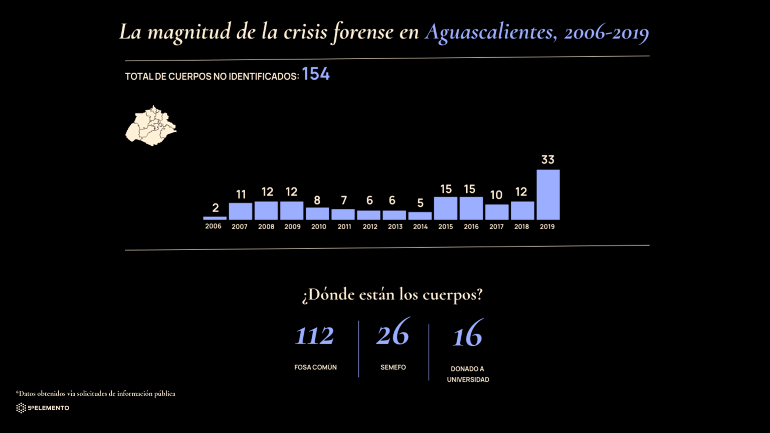 En Jalisco hay oficialmente 3 mil 682 personas sin identificar, una tercera parte de las 11 mil 97 personas desaparecidas en ese estado hasta octubre del 2020. En contraparte, Aguascalientes tiene un registro de 255 personas desaparecidas, aunque la Fiscalía estatal reconoce sólo 110.