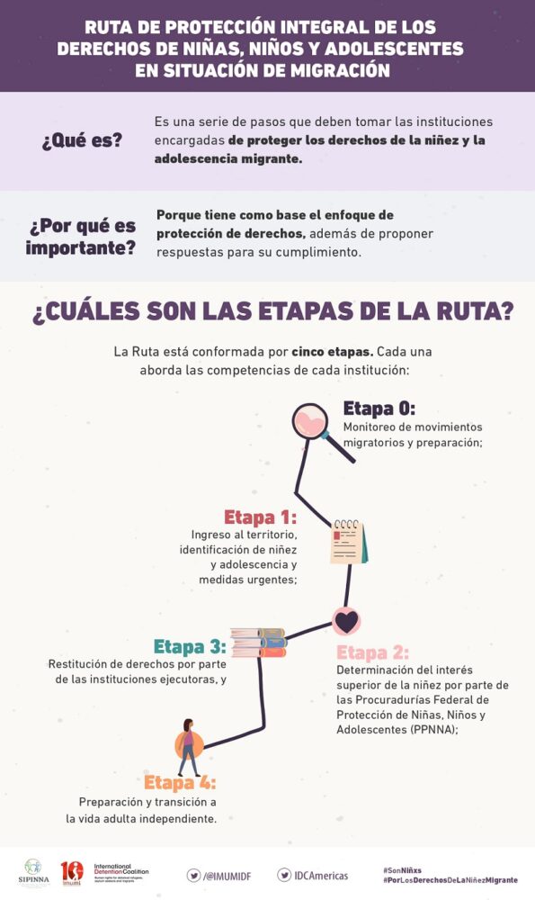Mientras tanto, la Ruta de Protección Integral de los Derechos de Niñas, Niños y Adolescentes en Situación de Migración, implementará protocolos, procedimientos e instrumentos para atender las necesidades específicas de cada niña, niño y adolescente migrante en México.