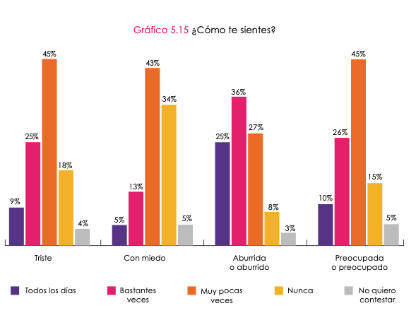 En el Informe se presentaron preguntas para conocer cómo están viviendo su encierro; por ejemplo: ¿Con quién vives?, ¿Qué tan seguido discutes con la persona que te cuida?, ¿Cuántos baños y cuartos tiene tu casa?, ¿Cuáles son las cosas que más te preocupan? y la más dominante: ¿Qué significa el encierro para ti?